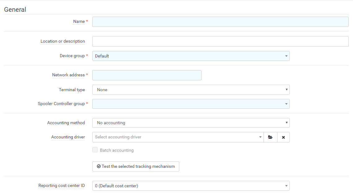- Spooler controller group - this option defines in which Spooler Controller will the device be registered. Choose one from the existing Spooler Controller groups.