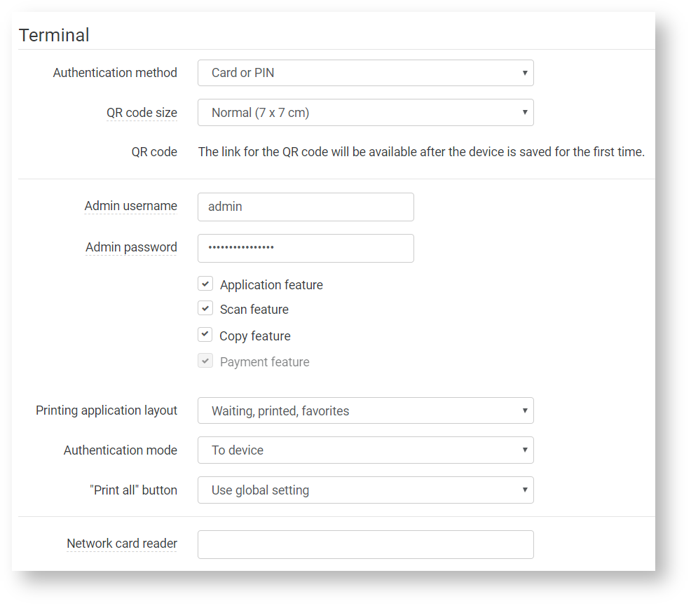 - (Advanced only) Copy feature - Enable this option if you want to enable YSoft SafeQ copy features. Available only for Cloud terminals