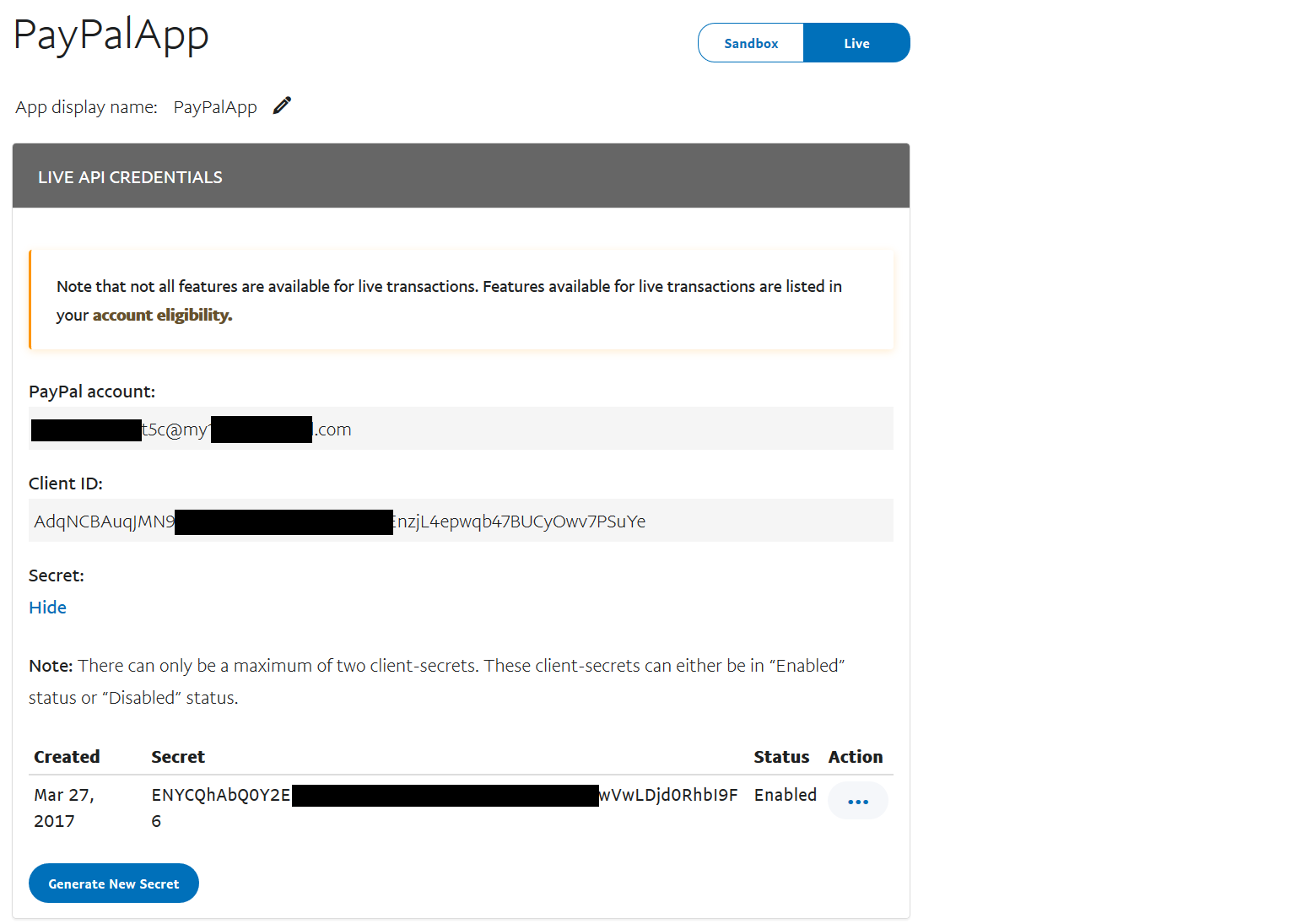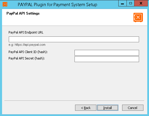 PayPal API Endpoint URL Use PayPal's service URL (usually https://api.paypal.com/). PayPal API Client ID (hash) Hashed username of your PayPal signature. PayPal API Secret (hash) Hashed password of your PayPal signature.