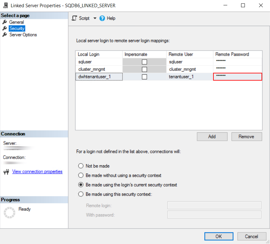 - On the Security page, update the Remote Password field for all the tenant users (i.e. update all the login mappings with Local Login in format "dwhtenantuser_i"). Use the tenant passwords from step number 4 (the values of '@tenant_password@' placeholder).