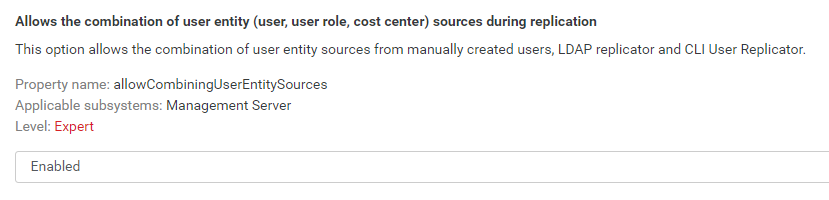 By default, the User Replicator will not edit user entities (user, user role, cost center) created from different source (e.g. LDAP replication). To allow such editing, please see section Allow to combine user entity sources.