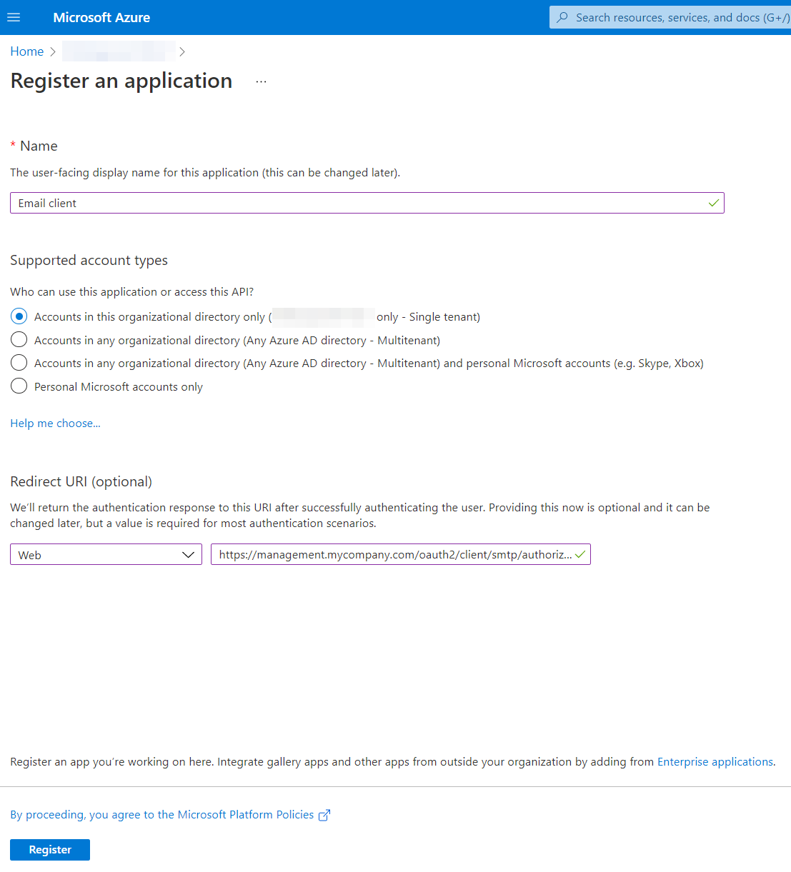 - Accounts in this organization only (Single tenant) is preferred if this App registration will only be used for YSoft SafeQ Emails