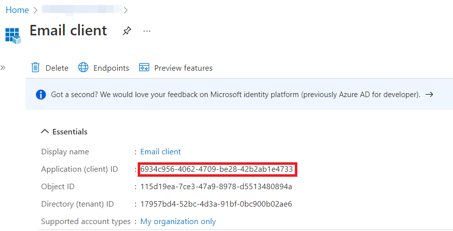 - On the created Client registration, under Overview tab, take note of the Application (client) id (when prompted later, enter it to the Client ID field in YSoft SafeQ)