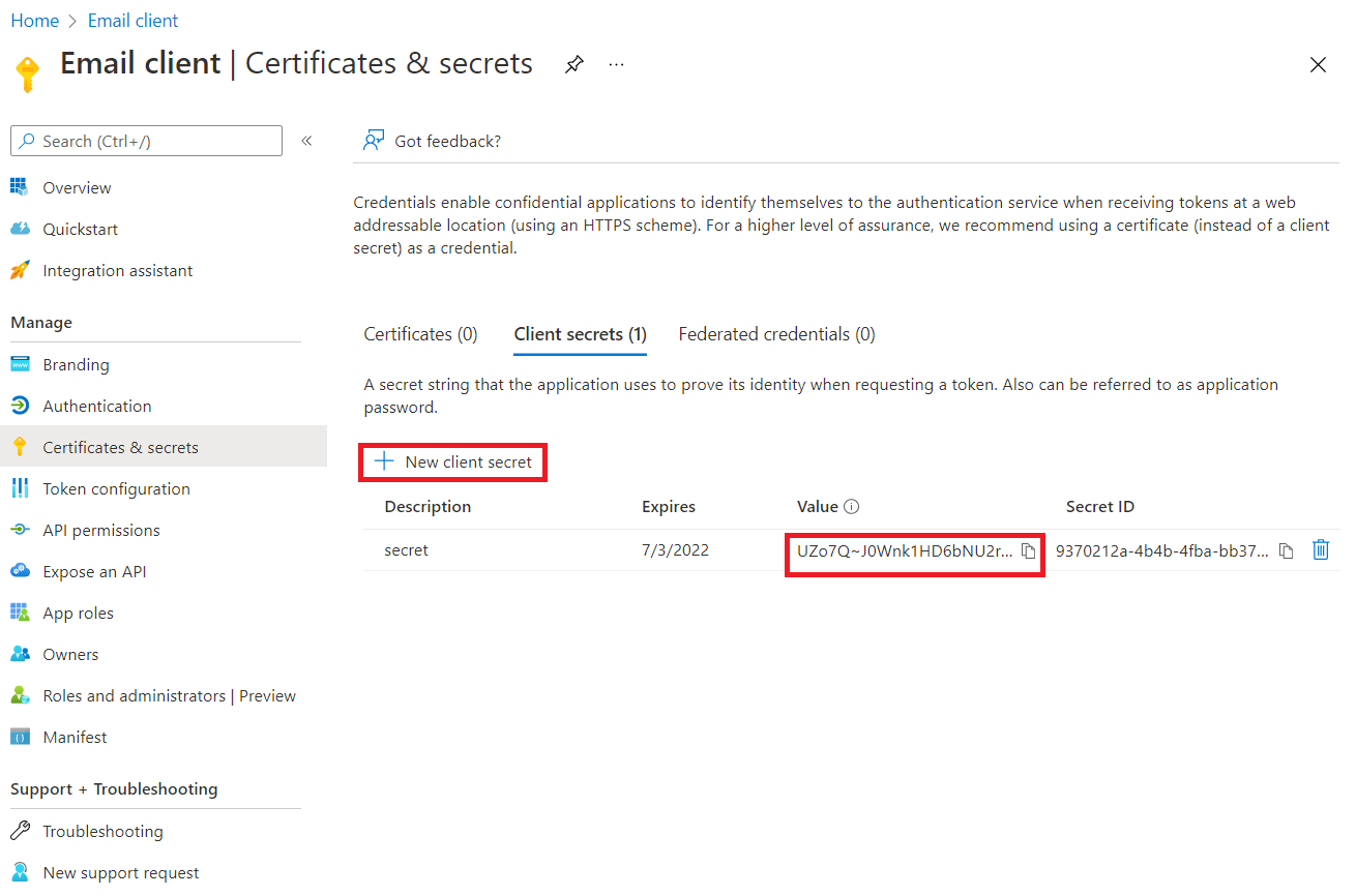 - Under Certificates & secrets, create a New client Secret (choose name and validity according to your needs). Once created, take note of the Value (when prompted later, enter it to the Client Secret field in YSoft SafeQ)