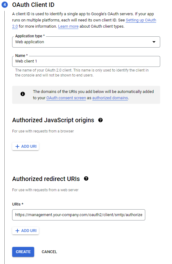 - In the Redirect URI section, select Web and fill in the following URL https://<management_interface_url>/oauth2/client/smtp/authorize-callback