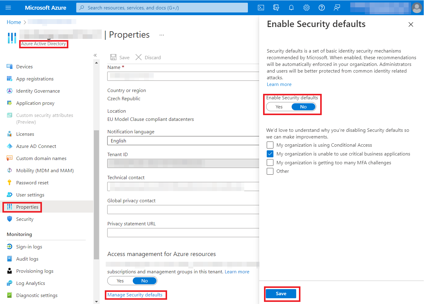 - Select Azure Active Directory > Properties > Manage Security Defaults > click No in Enable Security Defaults. Click Save.