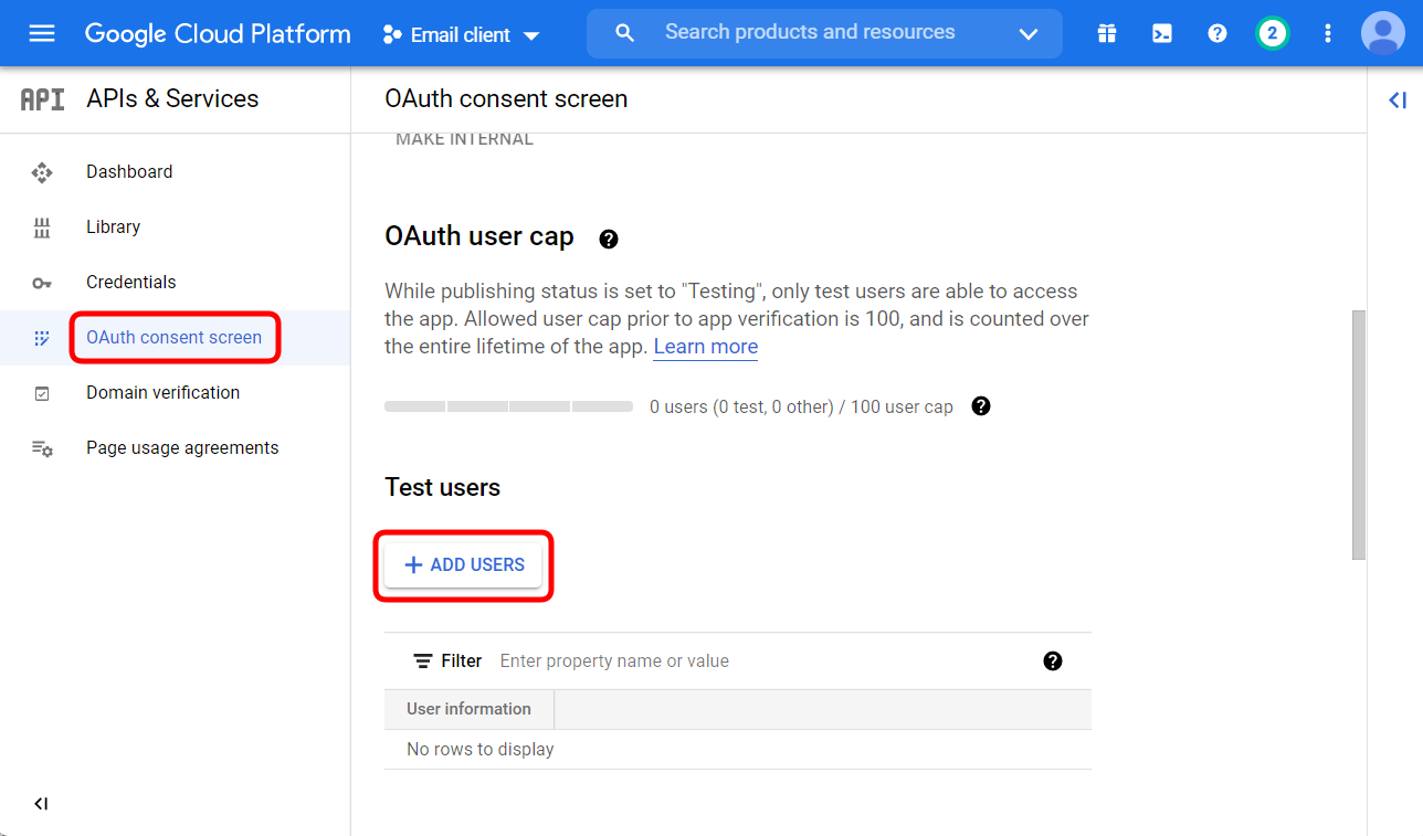 Select OAuth consent screen and in the Test Users section, click Add users. Input email of the users which will be used as email sender in YSoft SafeQ.