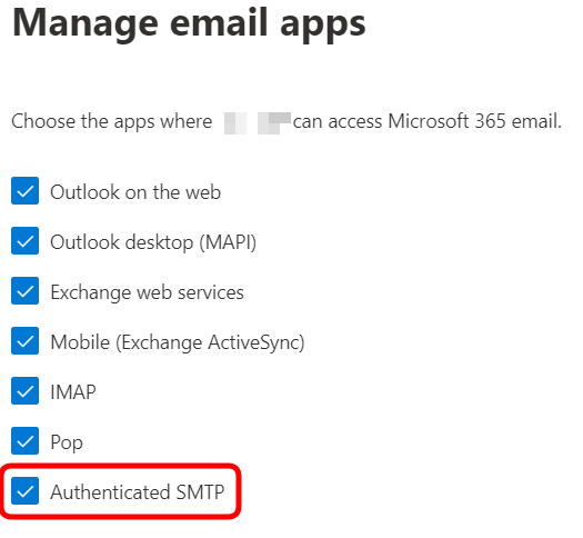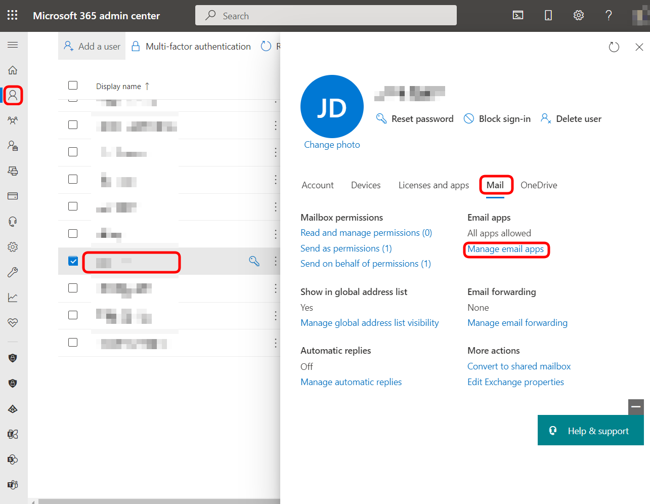 - Select Users > Active users > select your user > select Mail tab > click Manage email apps.