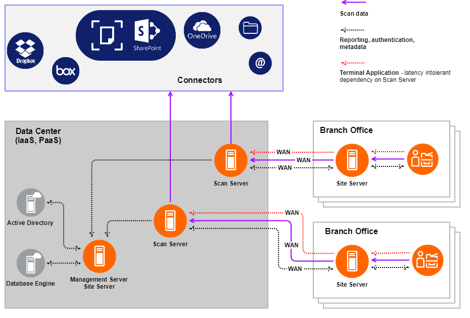 The customer does not need to duplicate powerful hardware at branch offices. The resource-intensive Scan Servers are deployed to a datacenter which already has powerful hardware.