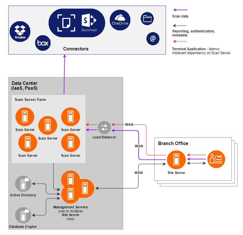 No third-party network load balancer is required. Each branch office uses one Scan Server. Multiple branch offices can share a common Scan Server. See the Scanning Farm scenario below when more Scan Servers are required to process scans from a single branch office.
