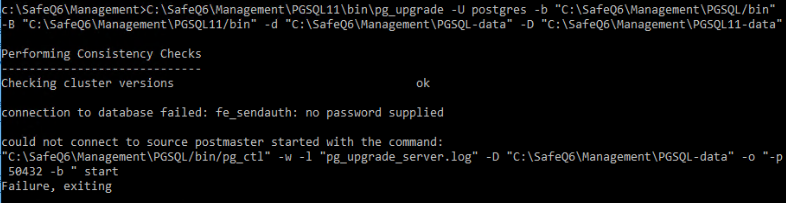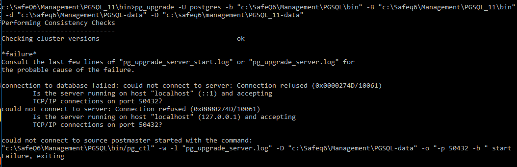 Upgrade PostgreSQL data folder. Before executing pg_upgrade, make sure that Administrator account has granted Full controll permission for both old PGSQL and PGSQL-data directories and new PGSQL_11 and PGSQL_11-data directories.