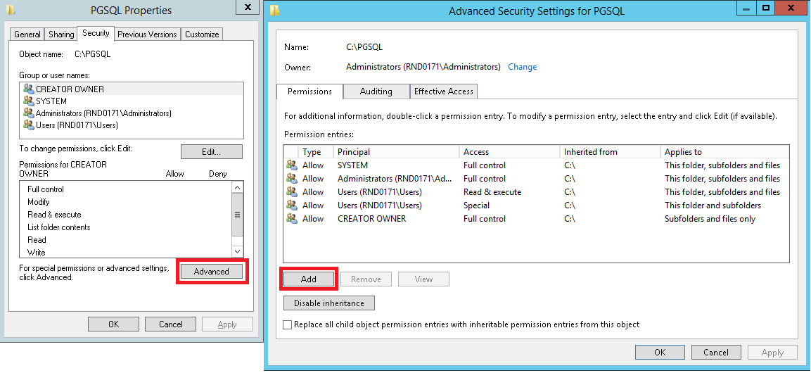Administrator account should have Full control permission set for both old PGSQL and PGSQL-data directories and new PGSQL_11 and PGSQL_11-data directories. On each directory: right click and select Properties → switch to Security tab → click Advanced → on Permissions tab → click Add