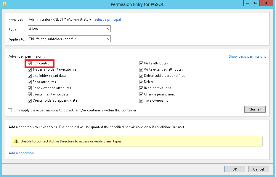 click on Select a principal link → fill in Administrator account (in our example it is RND0171\Administrator, this might differ on production environment) → click OK.