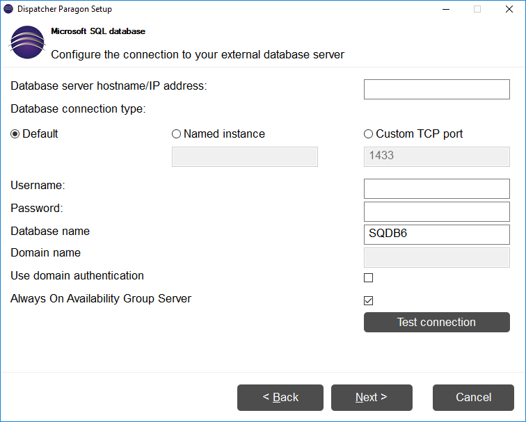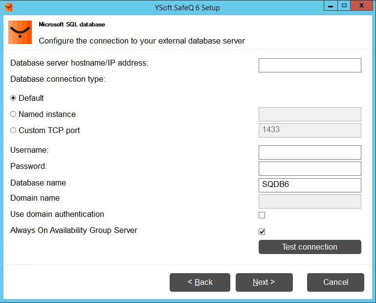 - Fill all required fields in the Microsoft SQL database screen: