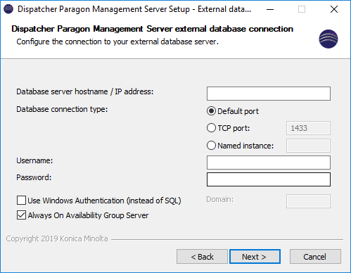- On the Database configuration screen select the External Microsoft SQL database server option