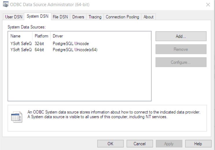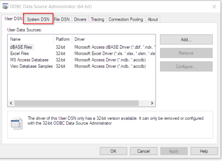- Open ODBC Data Source administration for 64bit platform, switch to "System DSN" tab