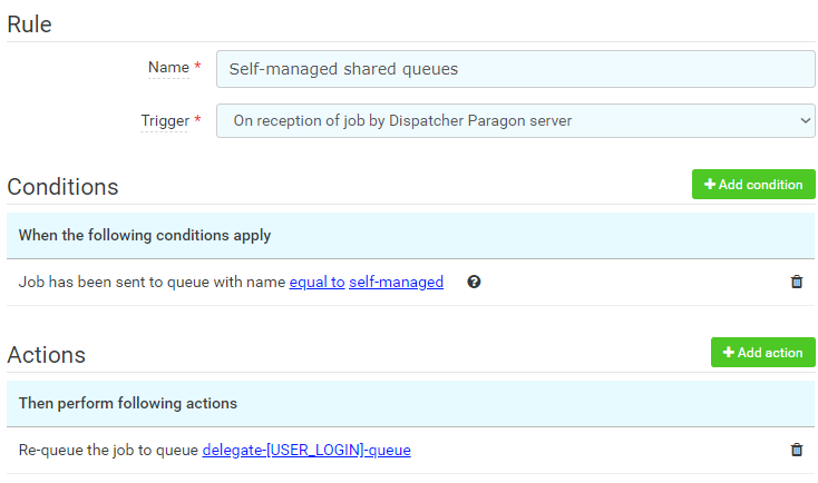 Standard shared queues, as documented above, can be a burden to manage as all work is done by administrator. Some customers prefer to let users do the work themselves, for which we can use Rule-Based Engine and the SWC-49 product extension (Web interface for delegated print queue), see