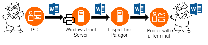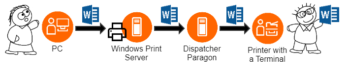 From configuration point of view, it is necessary to create a new rule in Rule-Based Engine, which redirects all print jobs from the shared printer into user's personal shared queue.Next, create a shared printer.