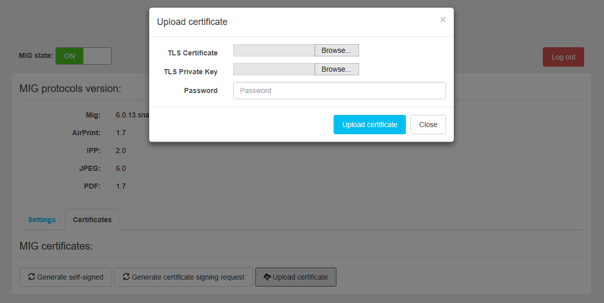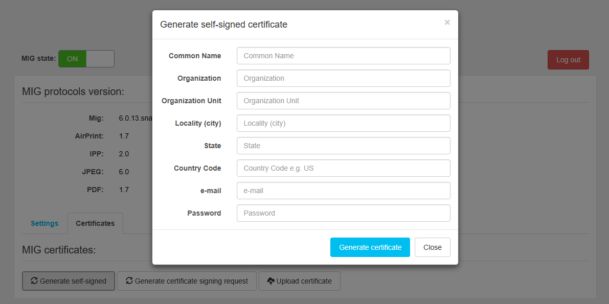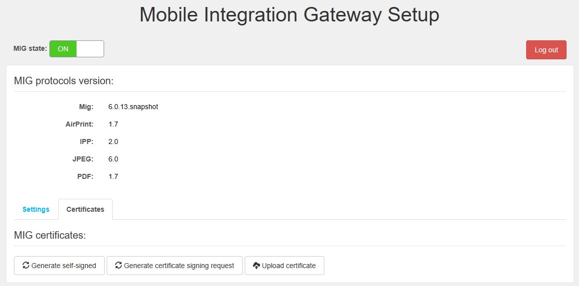 Mobile Integration Gateway provides a web interface for configuring Mobile Integration Gateway service. After log in, administrator can modify announced printer name and location and manage server certificates, i.e. create a certificate signing request and upload back the signed certificate chain, which will then be used for HTTPS connection to the Mobile Integration Gateway.