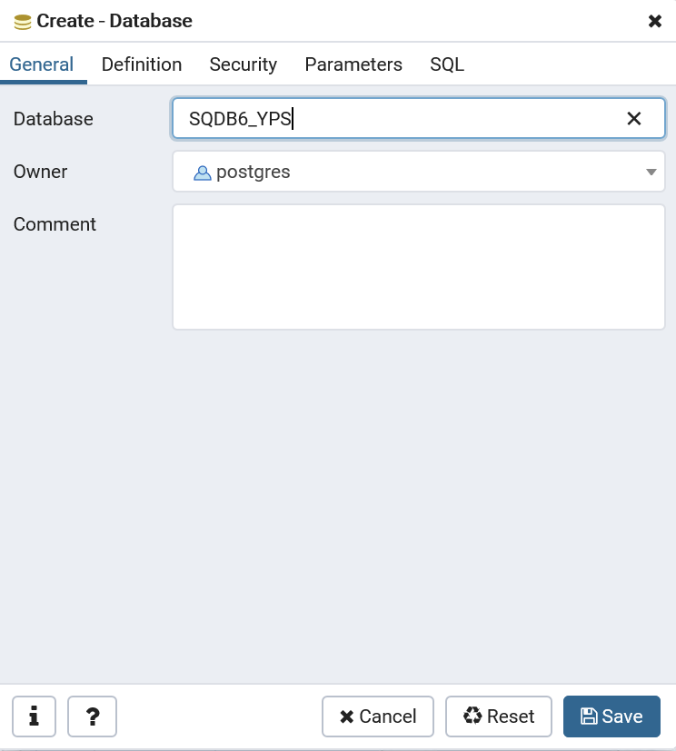 Create a new SQDB6_YPS database with Owner set to postgres: