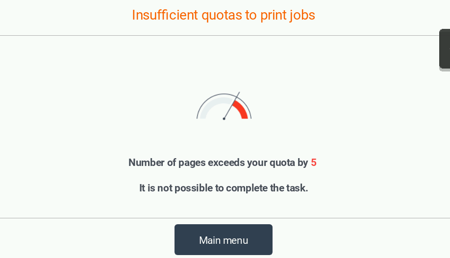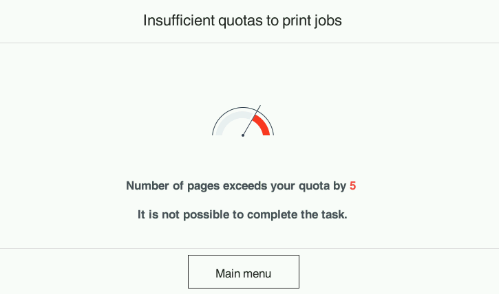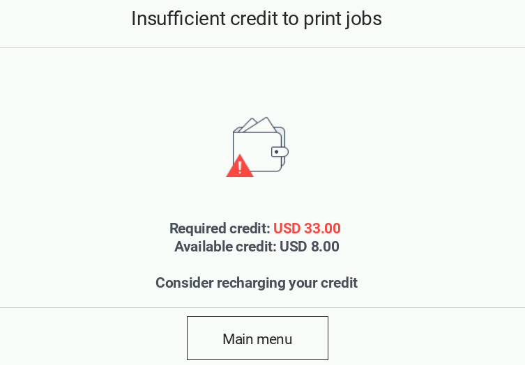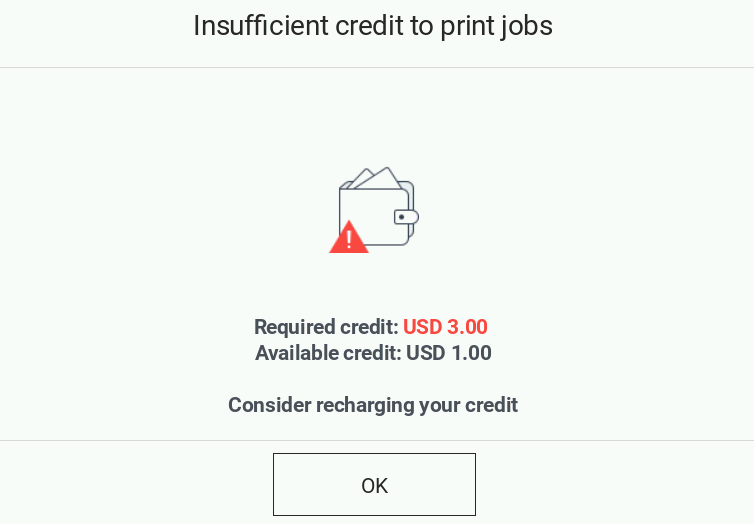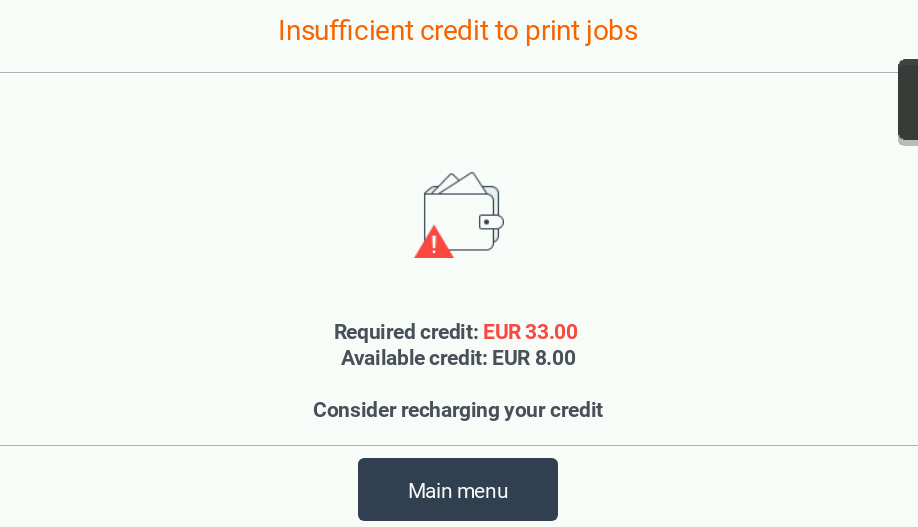 Note: this screen can be also displayed after a successful print/copy/scan job in case the user depleted all his remaining balance on this job.