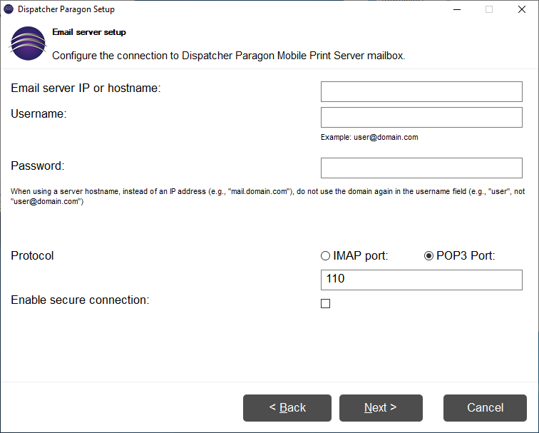 On this page, a connection to an incoming mailbox must be configured.
